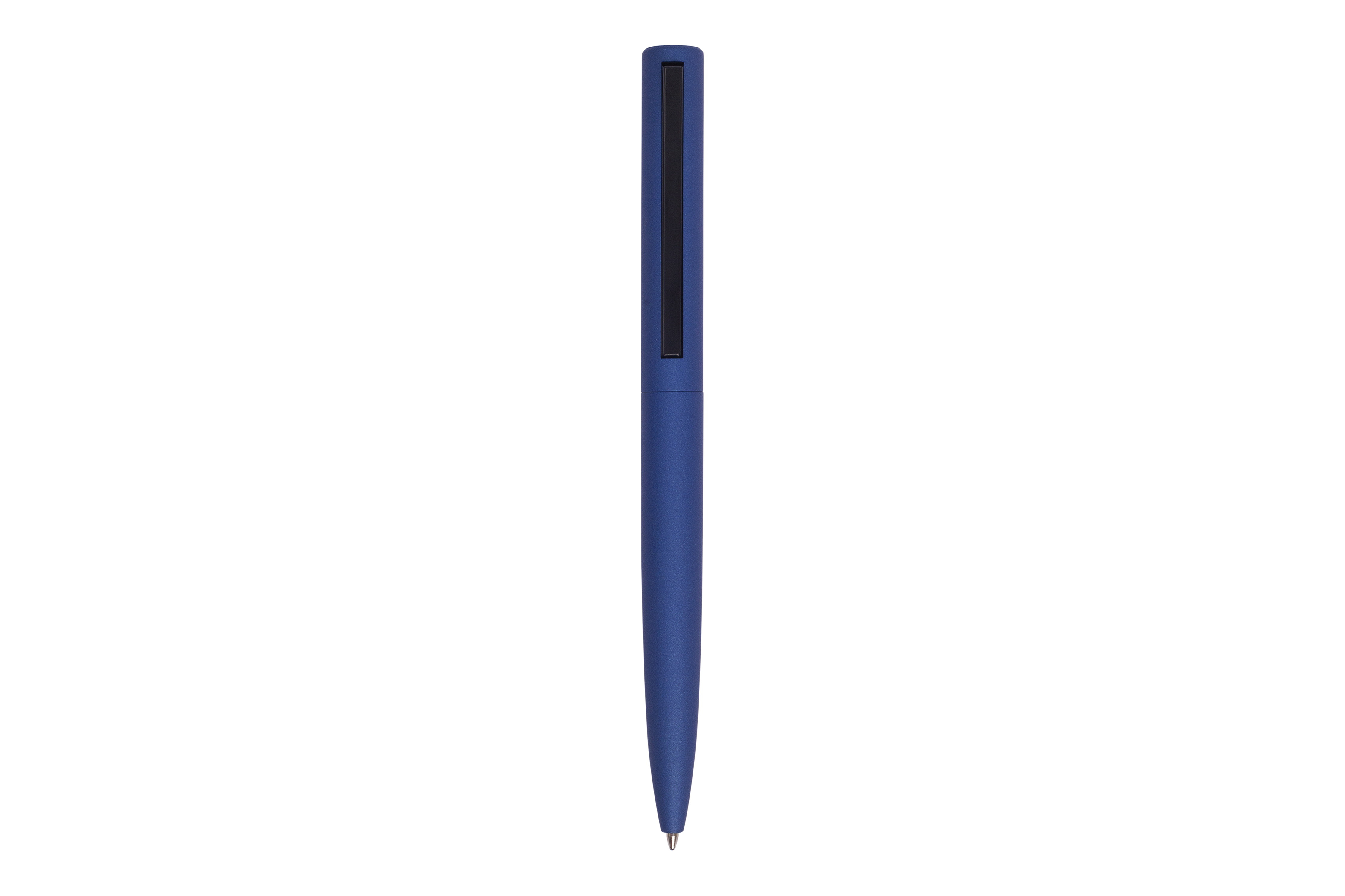 Metal. Cuerpo en metal, parte superior plástica con detalle de color negro. El clip funciona como pulsador. Ideal para imprimir en tampografia. Tinta azul.