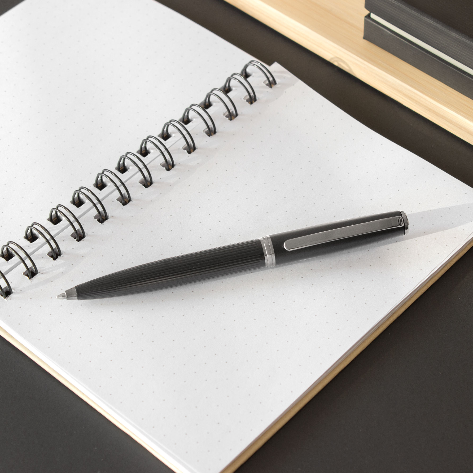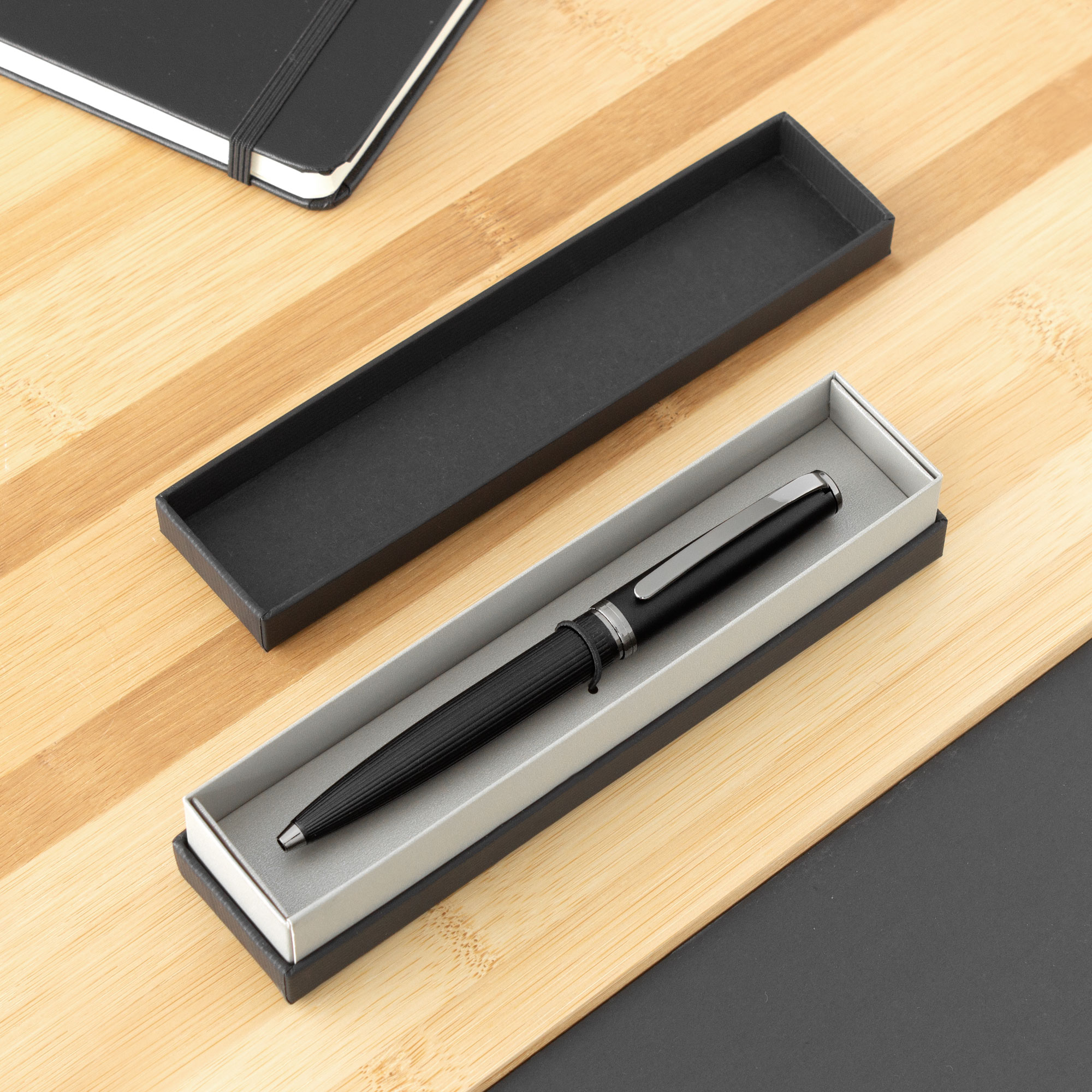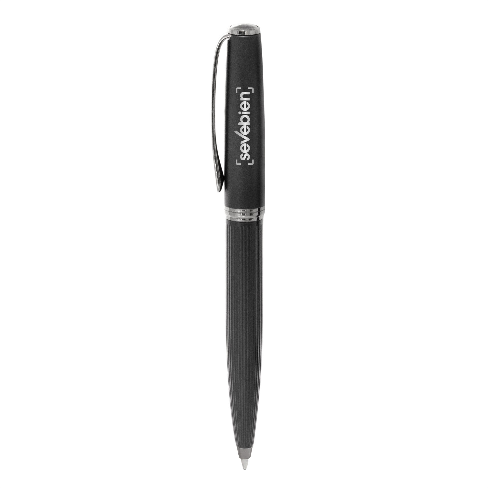 Metálico. Cuerpo color negro mate. Puntera, clip y anillo metálico. Apertura giratoria. En la parte superior destape electroplateado. Parte inferior texturada para mejor agarre. Tinta azul. Recarga metálica. Presentación en caja de regalo.
