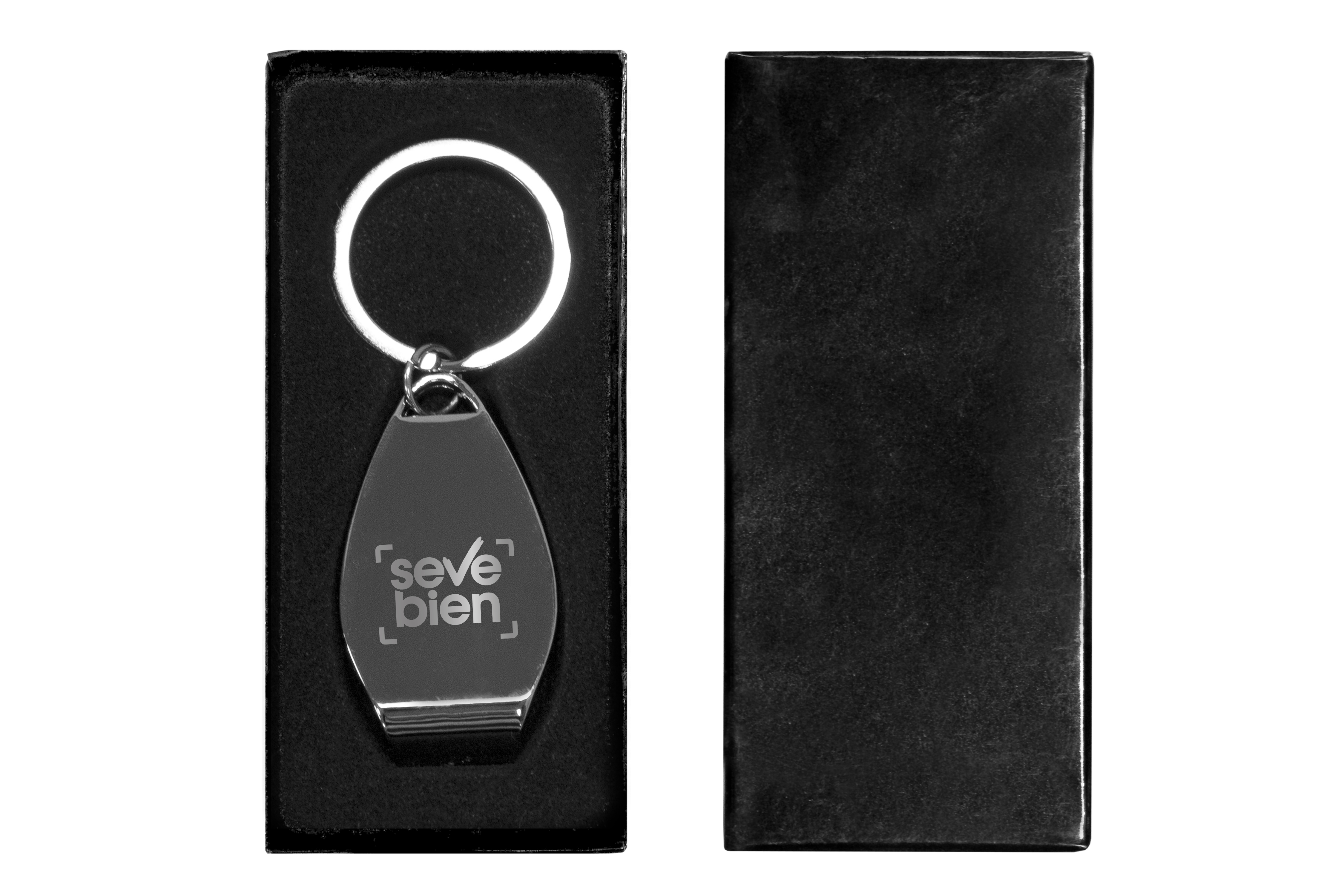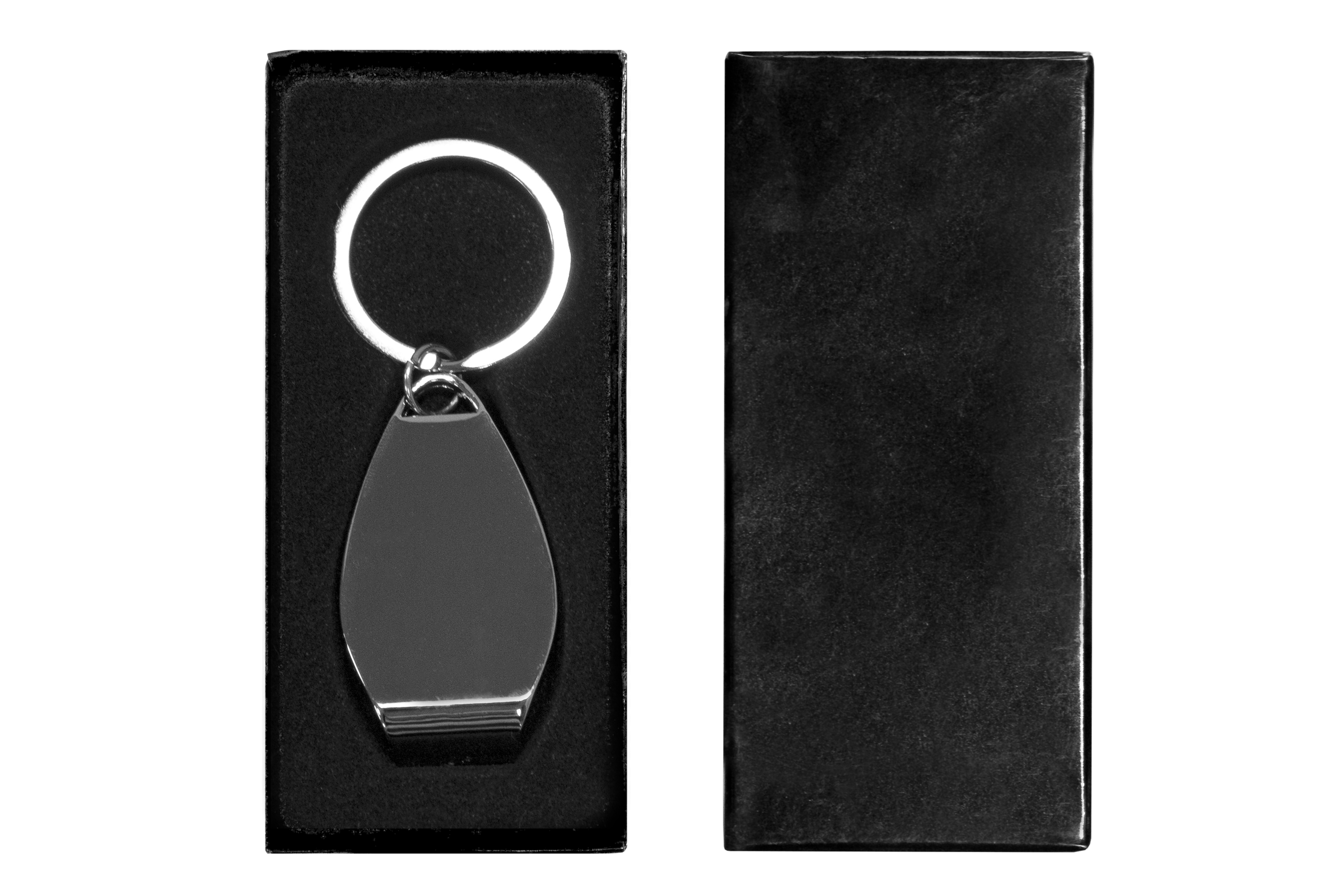 2,8 x 1 x 5 cm Metal. Llavero plano que se puede usar como destapador. Presentación en caja de regalo.