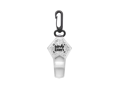 7,5 x 4 cm. Material reflectante. Silbato transparente con formato romboide. Mosquetón color negro.