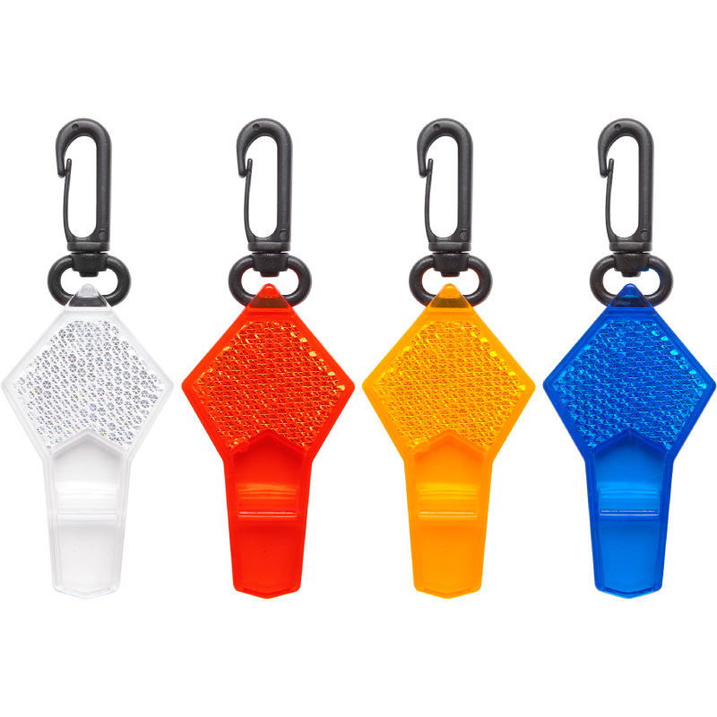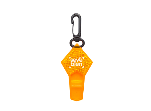 7,5 x 4 cm. Material reflectante. Silbato transparente con formato romboide. Mosquetón color negro.