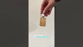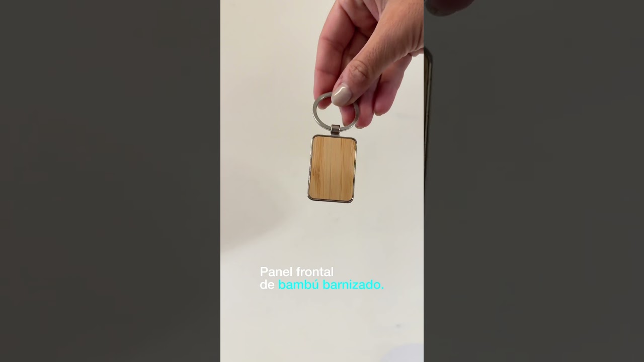 Llavero con forma rectangular. Estructura metálica con aleación de zinc con acabado brillante y panel frontal de bambú barnizado.