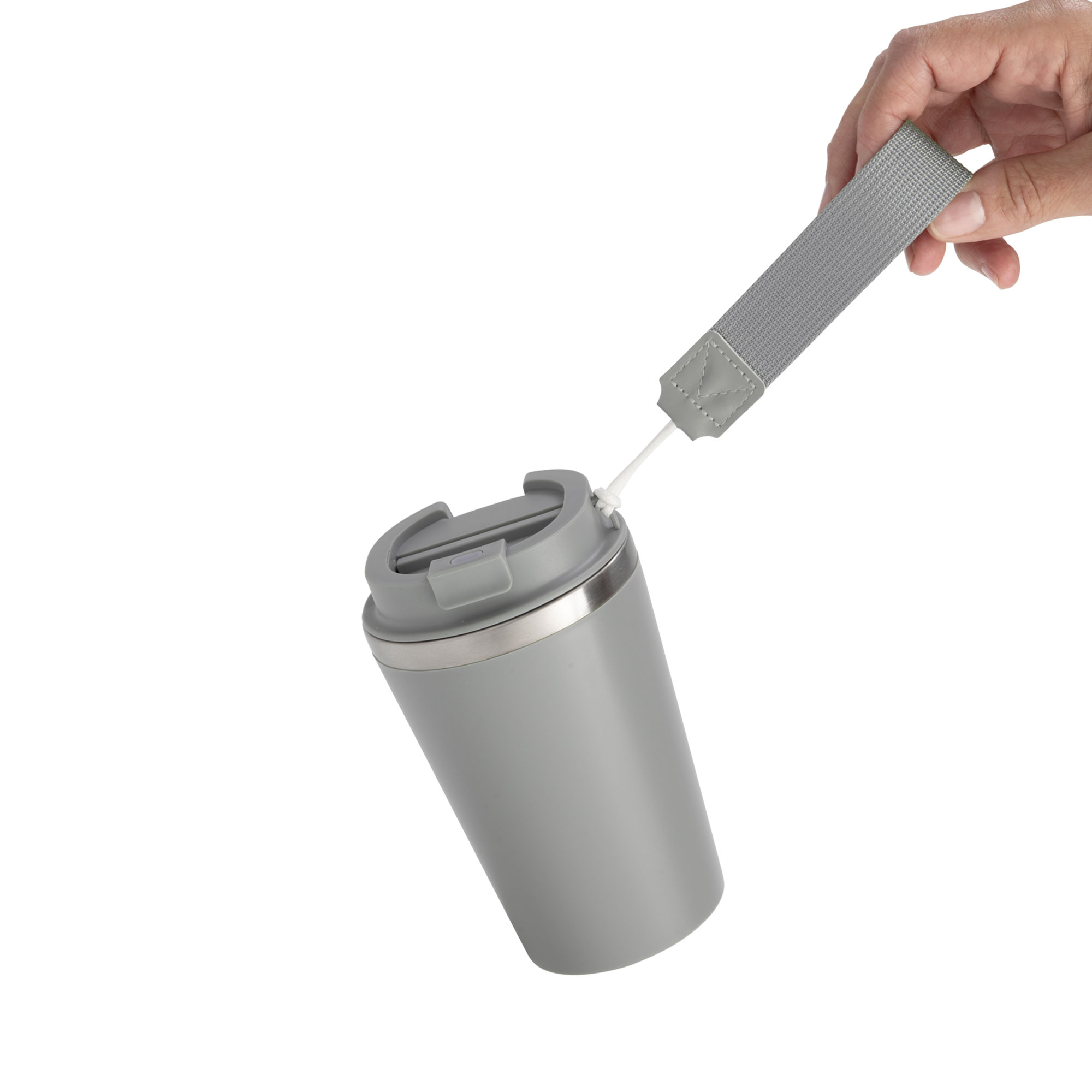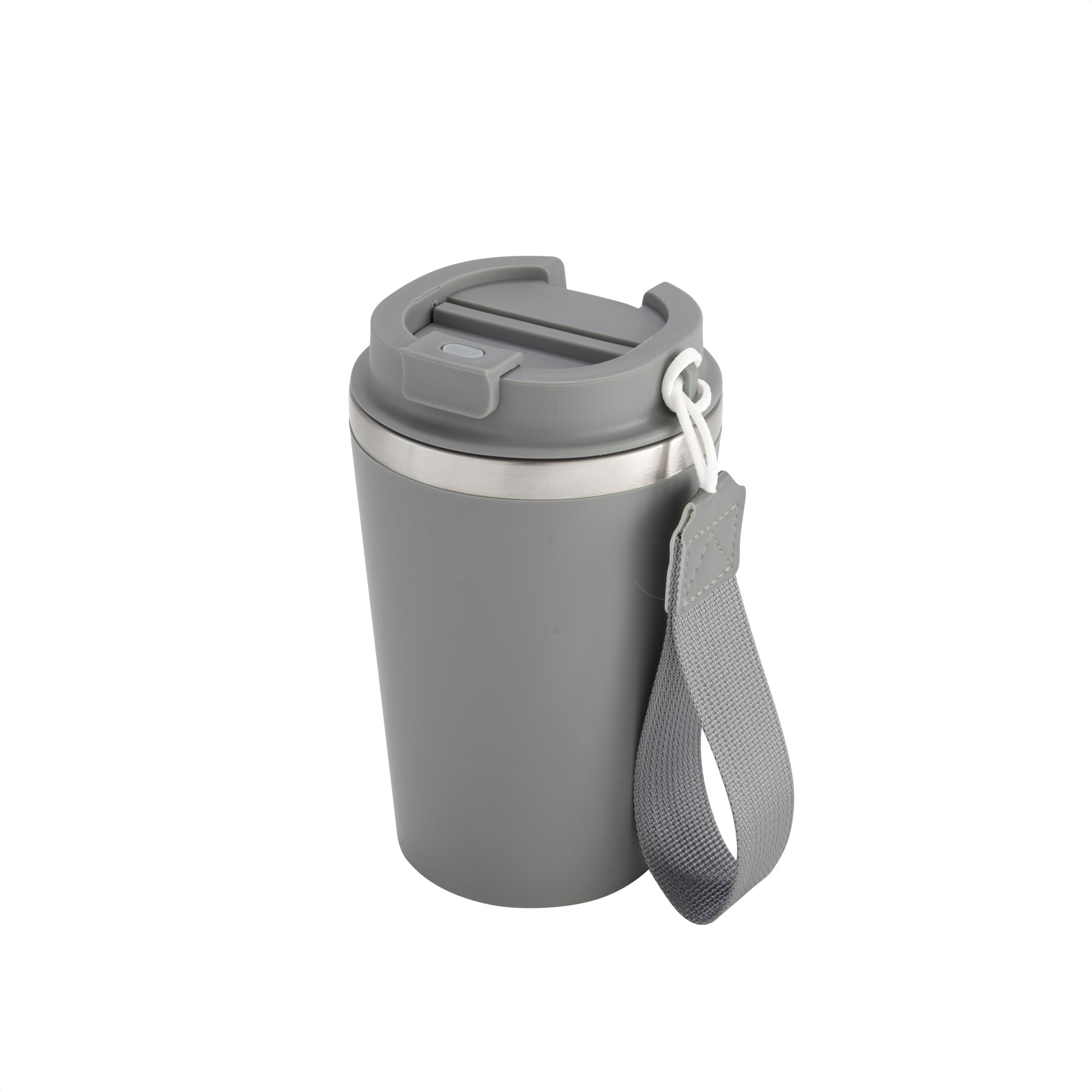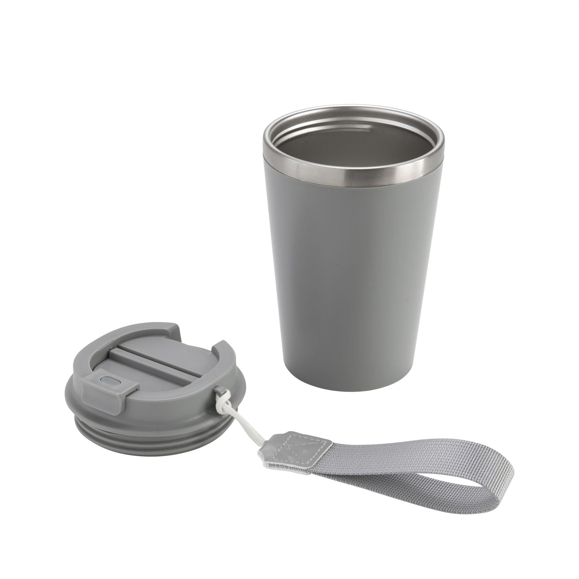 Mug doble pared con asa colgante. Interior de acero inoxidable 304 y exterior de Polipropileno con acabado mate. Tapa a rosca de polipropileno con anillo de silicona y seguro antiderrame del mismo color del mug. Asa de poliuretano y poliéster.