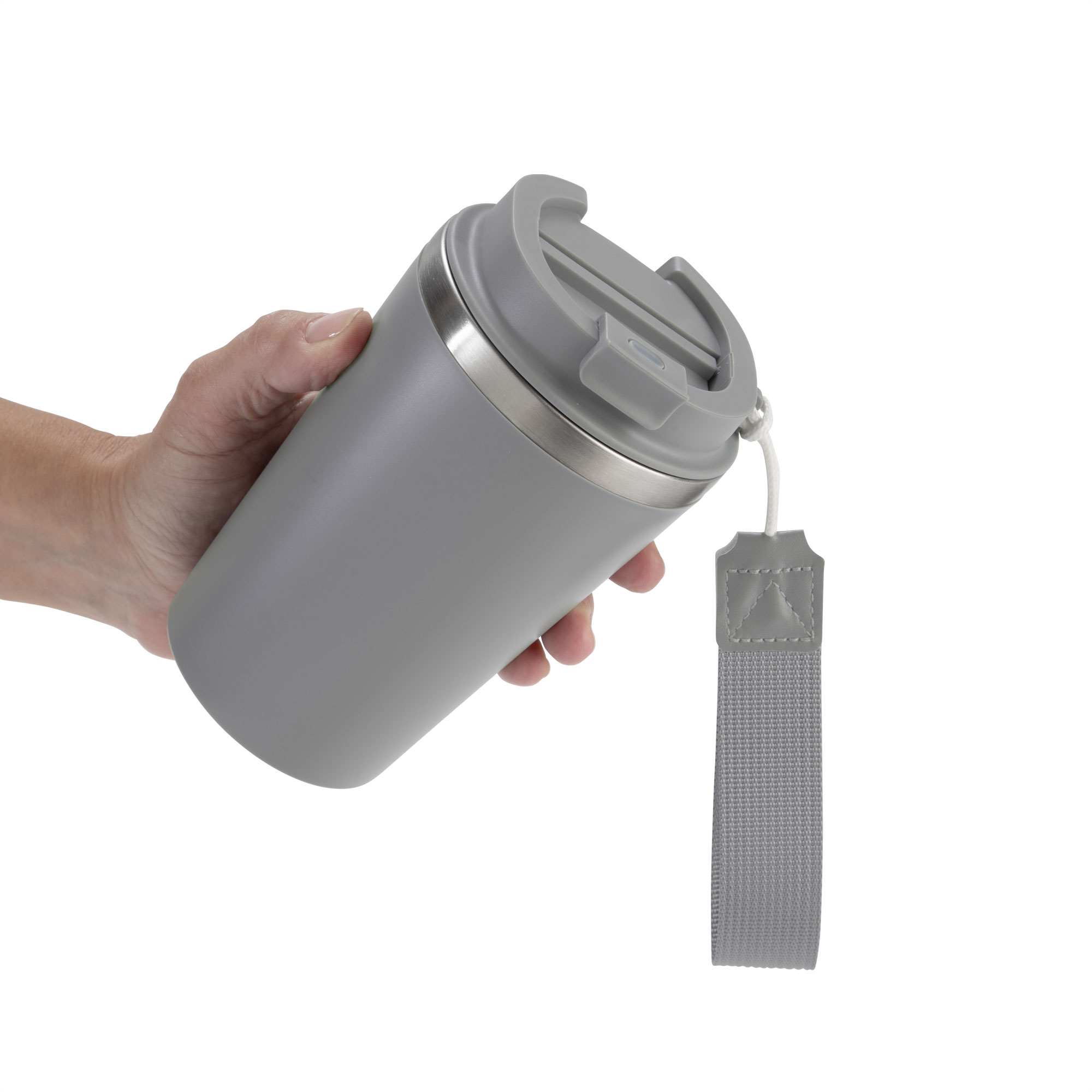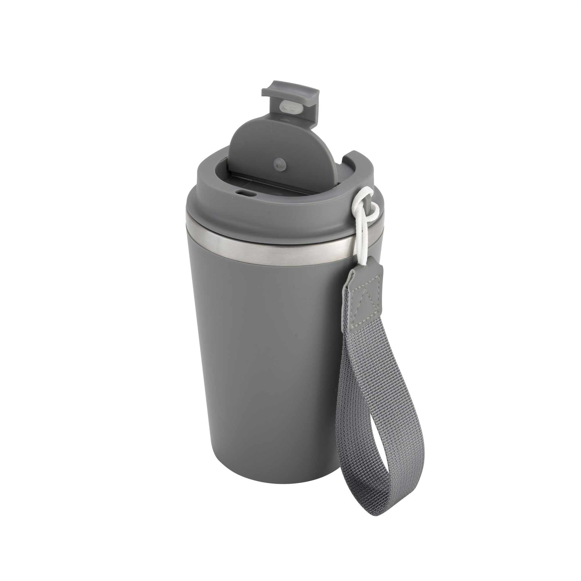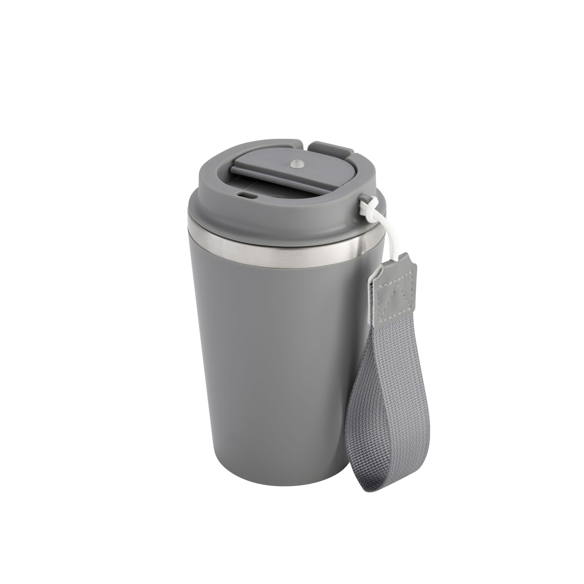 Mug doble pared con asa colgante. Interior de acero inoxidable 304 y exterior de Polipropileno con acabado mate. Tapa a rosca de polipropileno con anillo de silicona y seguro antiderrame del mismo color del mug. Asa de poliuretano y poliéster.
