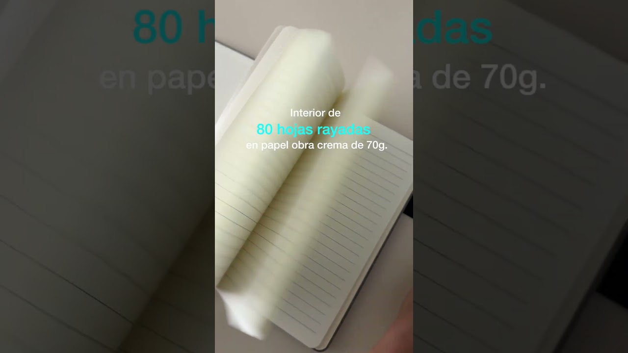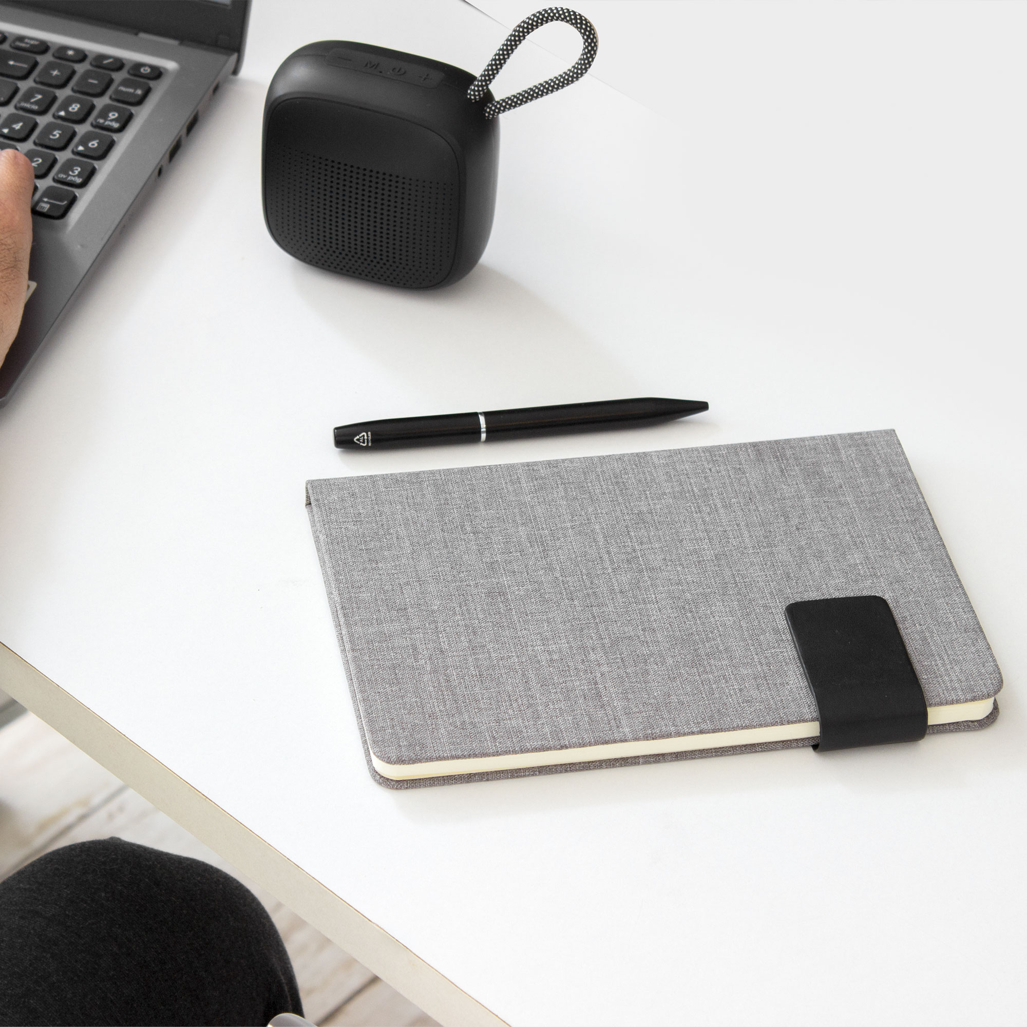 Libreta. Tapa de cartón de 1,8 mm recubierta en RPET color gris con tira de poliuretano color negro con cierre magnético. Interior de 80 hojas rayadas en papel obra crema de 70g. Encuadernación cosido. Incluye cinta señaladora del color de la tapa.
