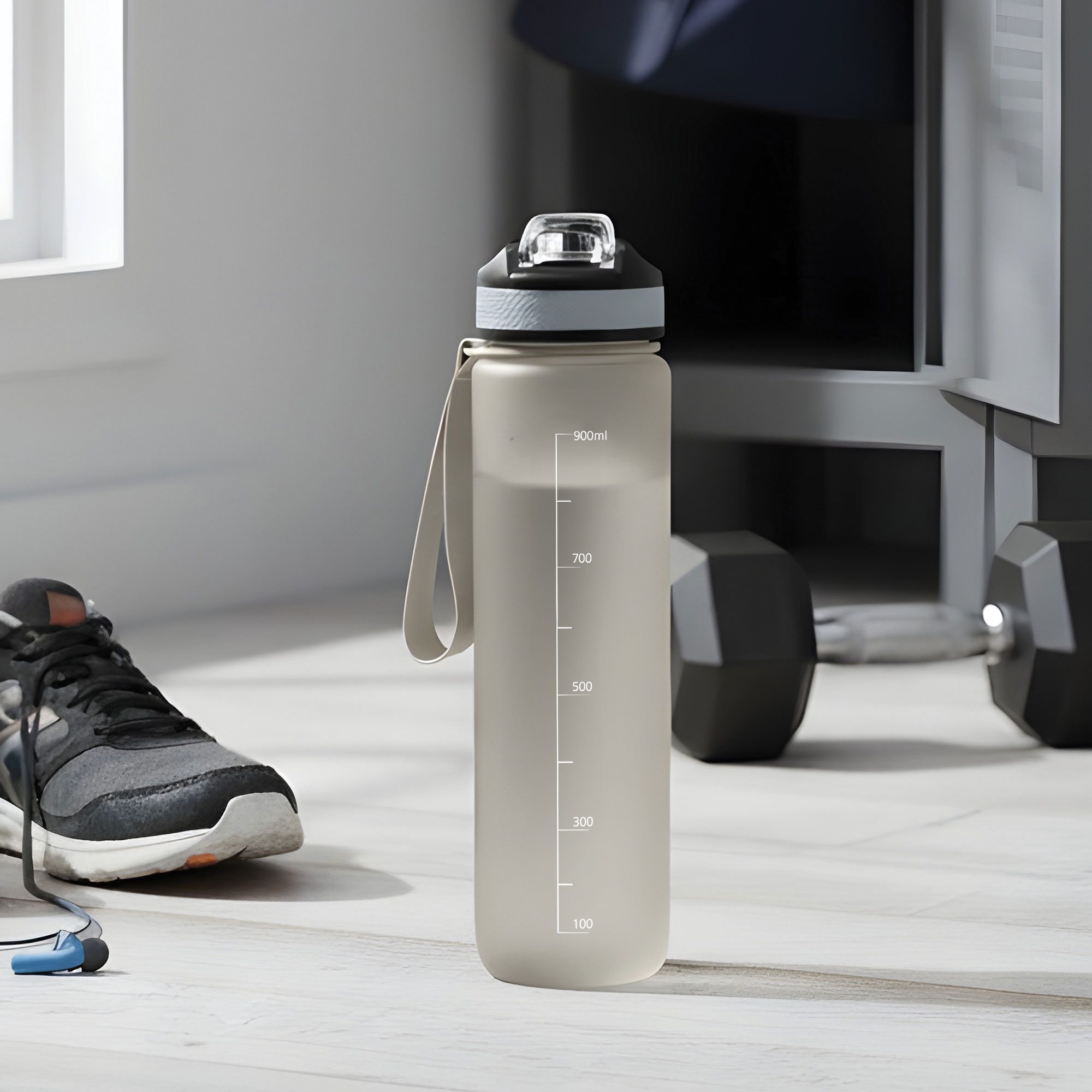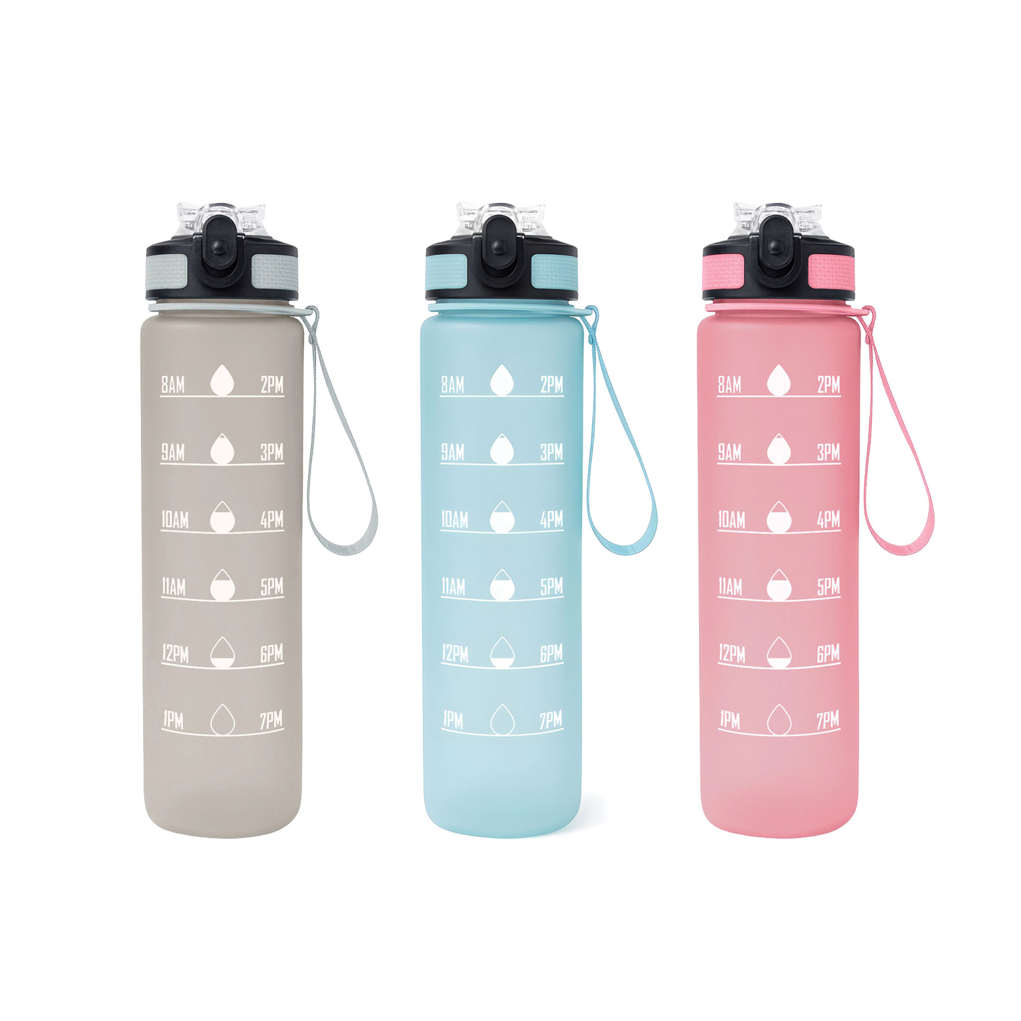 Botella con marcador de tiempo y medida. Color pastel con acabado frost. Tapa plástica combinada en color negro con el de la botella. Apertura rápida, boquilla transparente rebatible y sorbete incluído. Correa del mismo color de la botella.